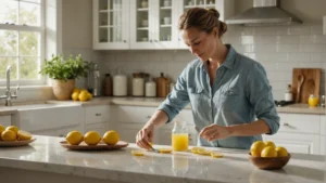 Les cuisines peuvent parfois être la source d’odeurs désagréables. Une solution simple est de disposer une coupe de vinaigre blanc ouverte dans un coin de la cuisine pour absorber les mauvaises odeurs. Les taches tenaces, comme celles du café ou du vin rouge, peuvent être traitées avec une pâte faite de bicarbonate de soude et d’eau. Laissez agir quelques minutes avant de rincer. Pour un parfum agréable dans votre cuisine, ajoutez quelques gouttes d’huile essentielle de citron ou de lavande dans votre seau d’eau de nettoyage.