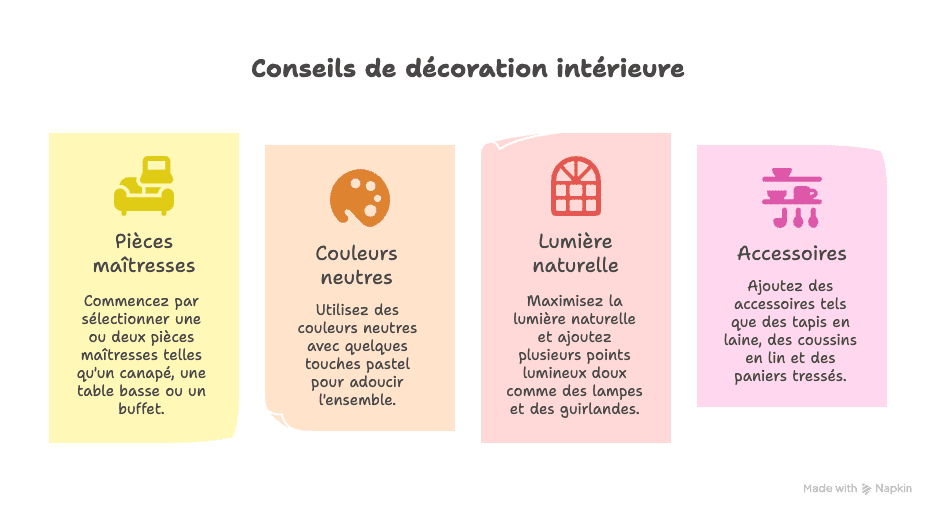 - Oser les accessoires : tapis en laine, coussins en lin, paniers tressés