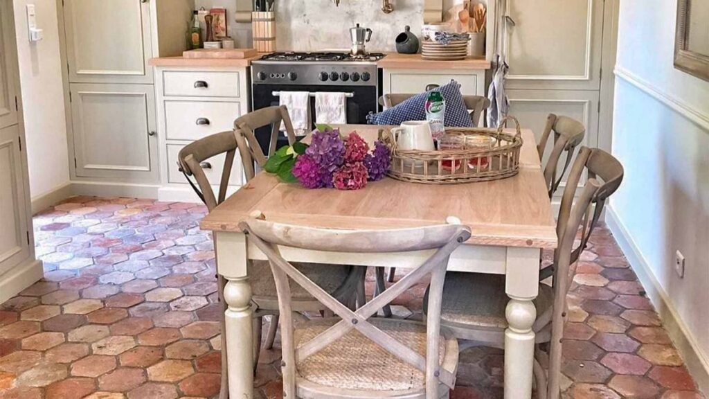Dans la cuisine, les tomettes peuvent ajouter une touche de chaleur à l’espace. Pour les mettre en valeur, il est recommandé d’opter pour des armoires de cuisine en bois naturel ou peintes dans des tons doux qui complètent la palette de couleurs. Les accents de métal, tels que les poignées de porte et les robinets, apportent une touche de modernité qui contraste avec le caractère rustique de ces carreaux. Un îlot de cuisine en pierre ou en bois massif peut également servir de point focal, créant ainsi un contraste texturé qui attire l’œil.