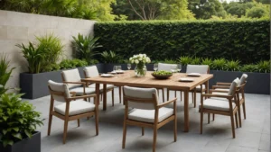 Les matériaux sont essentiels ! Optez pour des matériaux durables comme le teck, l’aluminium ou la résine tressée qui résistent bien aux éléments. Assurez-vous qu’ils sont traités pour résister aux UV et à l’humidité. Le teck, par exemple, est naturellement résistant aux intempéries et ne se déforme pas facilement. L’aluminium est léger, ne rouille pas et nécessite peu d’entretien. La résine tressée imite l’apparence du rotin naturel tout en offrant une résistance supérieure aux éléments, ce qui en fait un choix populaire pour les ensembles de salon et de salle à manger d’extérieur.